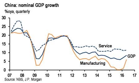 中国2016年第二季度GDP增长稳定,同比增长6.7%(摩根大通:6.7%;市场平均预测:6.6%),与第一季度的增长率持平。我们的季节调整流程显示,环比来看,2016年第二季度经季调后的实际GDP环比折年增长7.1%(摩根大通:经季调后环比折年增长7.0%),而第一季度为季调后环比折年增长6.2%。此外,从名义增长来看,2016年第二季度GDP同比增长8.4%,而第一季度为同比增长7.2%。