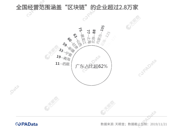 根据天眼查的数据显示,截至11月21日,全国(不含港澳台地区)经营范围含“区块链”的公司已经覆盖全国31个省、市、自治区,总数达到28345家。其中,广东省拥有17599家,占比超过62%,是第二名浙江的10倍还多。