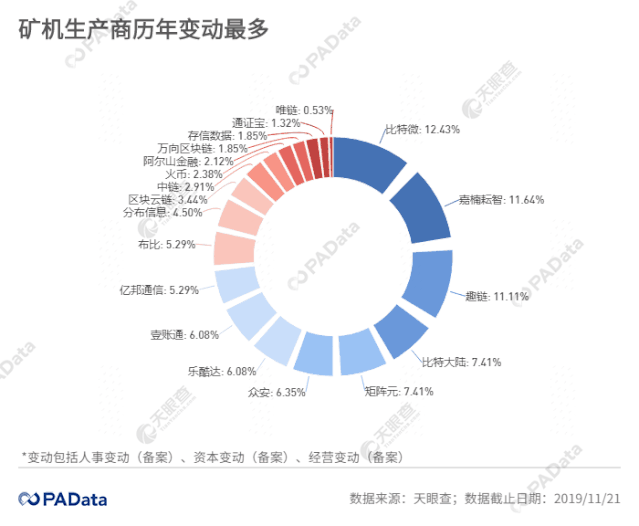 在20家公司中,深圳比特微电子科技有限公司是历年发生变动最多的一家公司,一共发生了47次,占比约为12.43%,其次是杭州嘉楠耘智信息科技有限公司,一共发生了44次变动,占比约为11.64%,杭州趣链科技有限公司一共发生了42次,占比约为11.11%。而近年内斗公开化的比特大陆一共发生了28次变动,占比约为7.41%。从变动主体来看,三大矿机生产商历年变动都比较多。