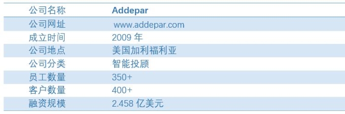 成立于2009年的Addepar是一家面向财富管理公司的大数据技术服务供应商,为财富管理公司提供资产数据的汇总、筛选、分析、报告生成等服务,以流畅、透明、高效的数据处理技术获得了众多客户的青睐。目前,平台共拥有超过400家的企业客户,包括金融集团Morgan Stanley、家族财富管理公司CAMCapital、私人银行Jefferies等。平台帮助客户管理了1.7亿美元资产。2020年,Addepar被福布斯评为全球金融科技公司前50强。