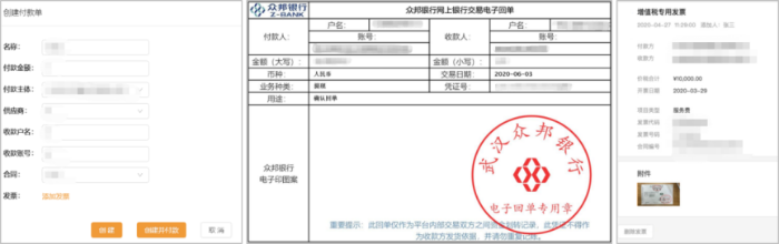·付款申请单、银行电子回单、发票图片或电子发票统一归集到Web后台,实现对公支付的三单合一
