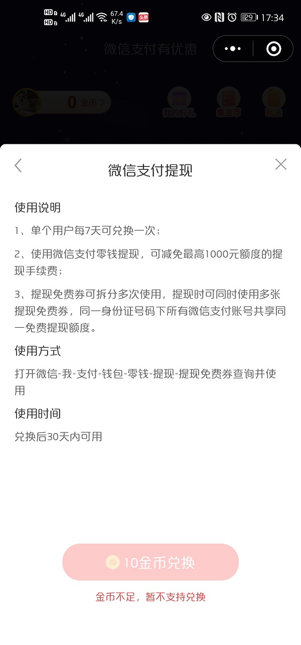 具体为用户使用微信支付消费,完成当周任务,即可领取对应金币,任务每周更新且不需用户激活,周任务所获得的金币需在周日晚24时之前领取至账户,逾期失效。目前金币主要可以兑换零钱提现免费券、微信支付立减金、商家优惠券等。同时金币兑好礼中的部分礼品数量有限,有兑换时间限制。