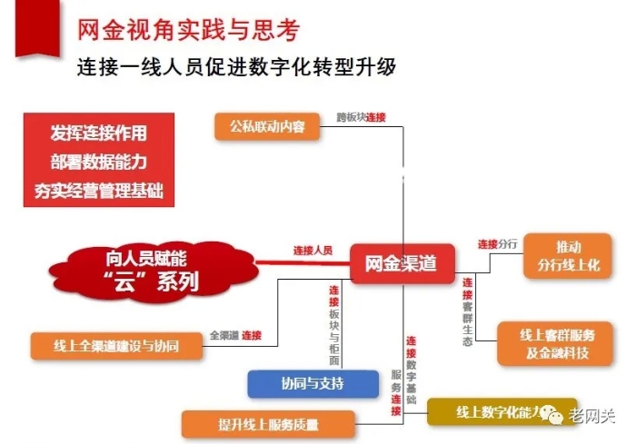 这就客观上对选准赋能一线人员建立线上化连接的有效结合点,选对数字化能力和工具的建设重点,画好具体需求蓝图,并能进行行之有效的实施推动和分行推广提出了更高要求。用线上化数字化经营思维和线上化连接的方式,让一线人员成为连接银行和客户的更有创造性和生命力的数字化智能化经营的重要组成部分,无疑是对传统经营管理模式进行赋能升级再造。