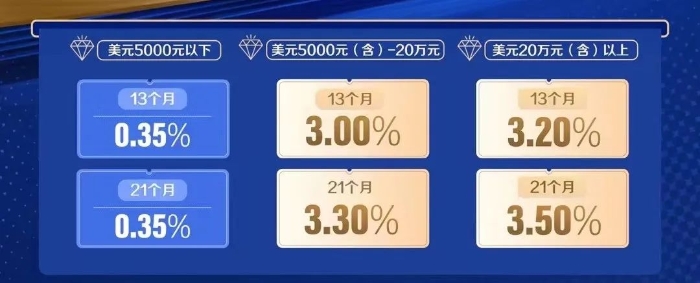 6月22日,每经记者致电该行,工作人员表示,“美元存款利率是有上涨”,有1年期利率1.4%和2%两款产品,区别在于前者额度较多,后者额度较少。起存金额均为2000美元。