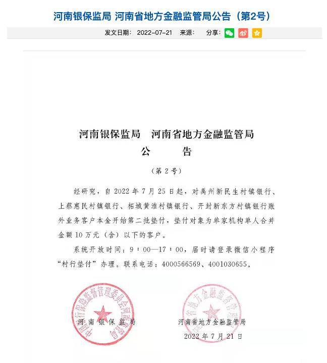 7月21日,河南银保监局、河南省地方金融监管局发布公告表示:经研究,自2022年7月25日起,对禹州新民生村镇银行、上蔡惠民村镇银行、柘城黄淮村镇银行、开封新东方村镇银行账外业务客户本金开始第二批垫付,垫付对象为单家机构单人合并金额10万元(含)以下的客户。