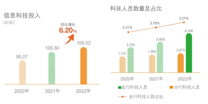 年报显示,邮储银行信息科技投入持续增加,2022年信科投入106.52亿元,同比增长6.20%。科技人才方面,不断充实科技队伍力量,坚持常态化招聘,总行IT队伍增加至4294人,全行超过6300人。队伍专业能力稳步提升,选拔143名青年、骨干人才,初步完成“青年、骨干、领军”三级人才梯队搭建。实施差异化专项绩效薪酬分配,进一步激发员工积极性、创造性。