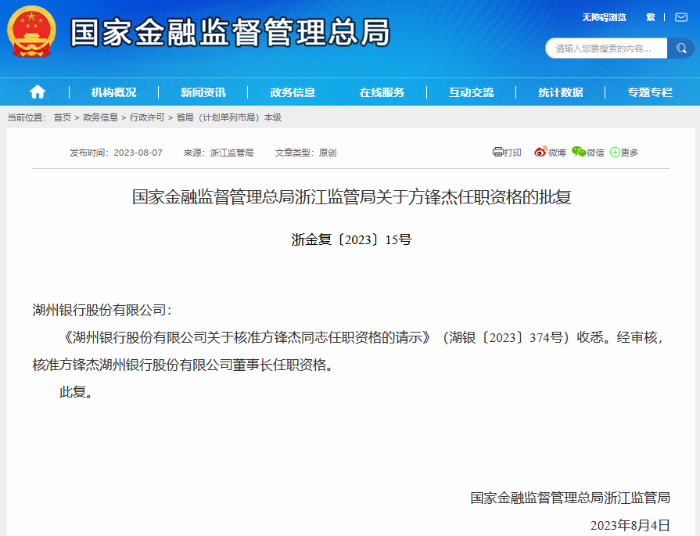 近日,据国家金融监督管理总局官网消息,湖州银行董事长方锋杰的任职资格获批。