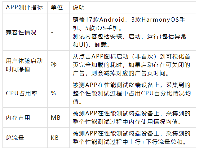 本次测试共分为APP兼容性测试、性能测试,共5个指标。包括主流手机设备兼容情况、APP用户体验启动时间、CPU占用率、内存占用、网络流量。