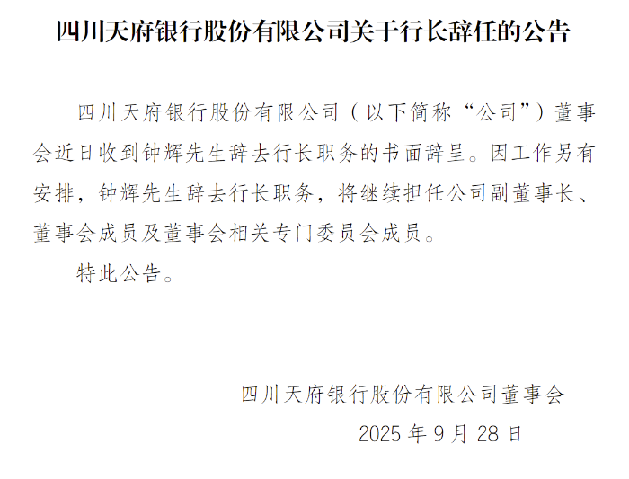 近日,四川天府银行正式发布公告,披露行长钟辉辞去该行行长职务的相关事宜。公告显示,四川天府银行董事会近期收到钟辉提交的书面辞呈,其辞任行长职务的原因系“工作另有安排”;辞任后,钟辉并未完全脱离该行,将继续担任四川天府银行副董事长、董事会成员,并履职董事会相关专门委员会成员。