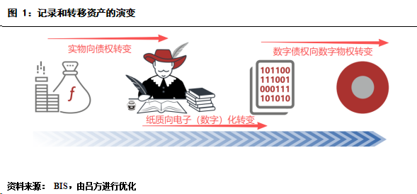 实物货币(以实体物权交换的货币体系)-》纸质信用货币(基于纸币承载的信用货币体系)-》电子货币(基于电子账户记载的数字债权的信用货币体系)-》数字货币(基于代币或电子账户记录的数字物权的信用货币体系)。