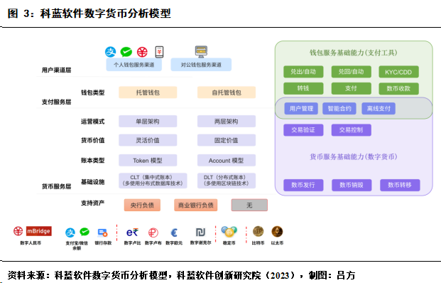 根据目前对各类数字货币的特性统计分析,我们通过用户渠道、支付服务、货币服务三层,同时通过支持资产、基础设施、账本类型、货币价值、运营模式和钱包类似六个维度,建立科蓝软件数字货币分析模型,并对CBDC、银行存款、第三方支付机构账户余额、RWA以及加密资产生态(含算法型稳定币和加密资产类产品)进行更具体的比较分析。