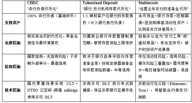 由此可见,支持资产的性质直接决定了代币的法律地位与信用基础。CBDC,作为中央银行直接发行的法定货币的数字形式,天然具备法偿性和最终清算功能。与之相比,代币化存款虽然提高了支付效率,但其风险权重和监管要求更为明确,且无法脱离银行信用的边界。所以CBDC双层运营架构中流通货币的支持资产(即央行负责,还是商业银行负责)决定了货币的属性和信用边界,这并不受货币名称、技术架构、运营架构等因素影响而改变。