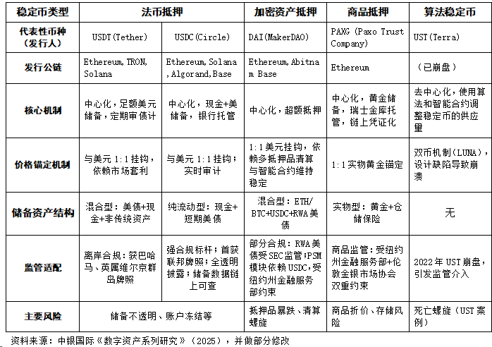 目前市场上流通的稳定币可归纳为四大锚定机制、十余种典型代币,主要包括①法币抵押型稳定币,主要包括USDT、USDC、PYUSD;②加密资产抵押型稳定币,主要包括DAI、sUSD、LUSD;③算法调控型稳定币,主要包括UST(已崩)、AMPL;④实物/商品抵押型稳定币,主要包括PAXG、XAUt。由于价值锚定机制不同,各类稳定币面临的信用风险存在差异,进而影响市场格局,截至2025年8月,法币抵押型的USDT和USDC已经达到市占率>90%以上,而且还在不断增加集中度,(法币抵押型美元稳定币单一币种就超九成),主要原因包括:价值锚定简单,采用1:1美元储备,用户认知成本最低;监管路径清晰,欧盟 MiCA、美国 GENIUS 法案均把"法币支持"列为首选合规范式;USDC 已获 MiCA 电子货币代币(EMT)牌照,USDT 正在整改,而USDC在2023年因银行存款风险事件后,调整储备类型。