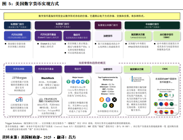而《GENIUS 法案》将进一步刺激法币抵押型稳定币规模的增长。2025年4月,美国财政部的一份报告 [ 详见美国财政部 《数字货币》,2025] 预计到2028年稳定币市场的市值可能达到2万亿美元。根据花旗集团的预测,到2030年,稳定币市场可能增长至3.7万亿美元。同时,通过对美国财政部《数字货币》中关于数字货币实现方式的内容分析(见图5),目前财政部的视角也是基于发币储备进行分类,例如,私营部门发币时,既使用商业银行负债的代币化存款,也涉及影响央行负债的代币化货币市场基金(MMF)和稳定币,因其资产储备为基于央行货币体系运营。