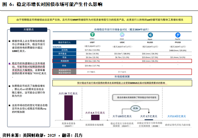 同时《GENIUS 法案》进一步规范了,支付型稳定币使用短期国债、银行存款或实物美元货币作为1:1支持资金,将进一步扩大对美国短期国债需求量(见图6),虽然未偿美债总体规模较大,但美债市场规模仅为6.4万亿美元(美国财政部,2024年底数据),根据预测2028年符合《GENIUS 法案》的支付型稳定币规模将达到2万亿,其中新增短期美债需求约1万亿,将降低美债利息成本,同时也会带来的副作用是减少1万亿银行存款,所以《GENIUS 法案》规定禁止稳定币付息,因为那样会加速银行存款向稳定币迁移。