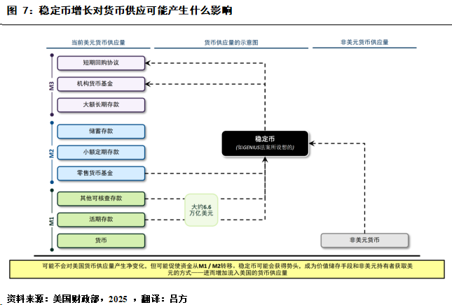 同时美国财政部也预测,稳定币市场规模扩张会加速其国内M1向M3的迁移,同时进一步加快非美元资产向美元资产的迁移,势必增强美元在国际货币体系的霸权地位。