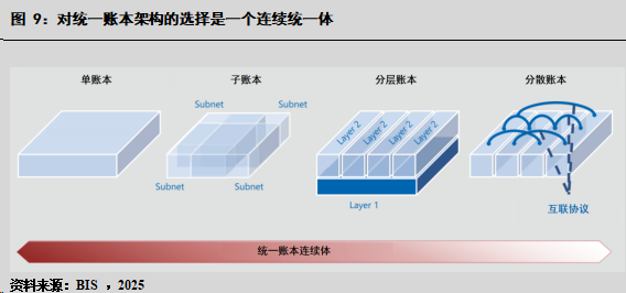 从高层次来看,基于数字签名技术的统一账本的技术架构可以用“统一连续体”来表示。其范围从一端的单一共享账本(Single Ledger)架构到另一端的异构分立账本(Disparate Ledgers),把各种账本架构视为一条光谱,而不是非此即彼的单点设计。在这两种选择之间有两种可供选择的架构:子网账本(Subnet Ledger)和分层账本(Layered Ledger),其目的是将两者的要素结合起来(图9)。统一账本架构的选择取决于其使用案例(如证券结算或跨境支付)以及对可编程性、可组合性、治理和数据本地化的相关要求。
