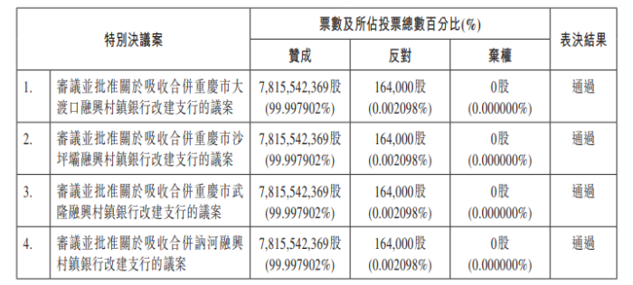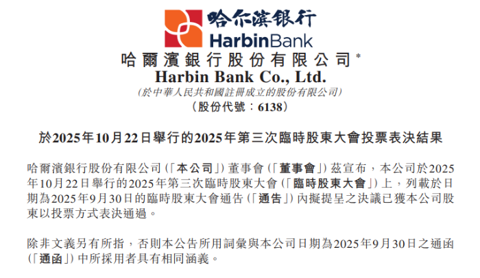 日前,哈尔滨银行发布公告称,该行2025年第三次临时股东大会投票审议并通过了四项议案,包括审议并批准关于吸收合并重庆市大渡口融兴村镇银行改建支行的议案、审议并批准关于吸收合并重庆市沙坪坝融兴村镇银行改建支行的议案、审议并批准关于吸收合并重庆市武隆融兴村镇银行改建支行的议案,以及审议并批准关于吸收合并讷河融兴村镇银行改建支行的议案。