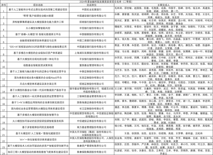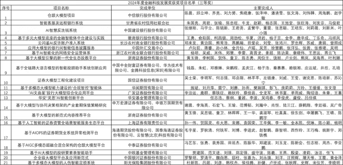 具体来看,在一等奖方面,有3个项目与AI相关,占一等奖的16.67%,分别是工行的“金融行业人工智能全栈安全风险检测平台建设和应用”、天弘基金的“基于大模型的FinAgent金融智能体系统”与中金公司的“‘九章’大模型机构应用平台”。
