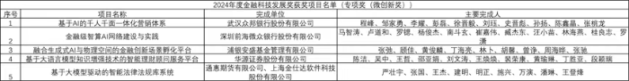 10月27日,中国人民银行发布《关于2024年度金融科技发展奖获奖项目的公示》。此次评选受理681个申报项目,经定性定量评价及评审领导小组审定,290个项目最终获奖,其中特等奖1项、一等奖18项、二等奖103项、三等奖148项、专项奖20项,涵盖自主可控、业技融合、数智化转型、风险防控等领域。
