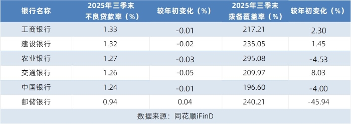 2025 年三季末,国有六大行不良贷款率大多呈现下降态势,工商银行、建设银行、农业银行、交通银行、中国银行较年初分别下降 0.01、0.02、0.03、0.05、0.01 个百分点,仅邮储银行微升 0.04 个百分点。整体来看,六大行不良贷款率处于 1.33% 以下,其中邮储银行以 0.94% 的不良贷款率在资产质量上表现最优,反映出国有大行在信贷风险管控方面持续发力,资产质量保持稳健向好的趋势。