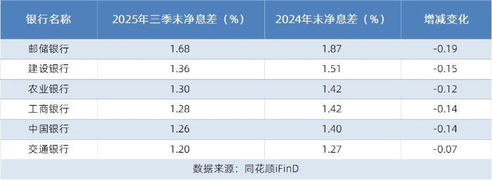 净息差是衡量银行经营能力的关键性指标。2025 年三季末,国有六大行净息差较 2024 年末均出现不同程度的下降。邮储银行净息差从 1.87% 降至 1.68%,减少 0.19 个百分点;建设银行、工商银行、中国银行降幅也在 0.14 - 0.15 个百分点区间;农业银行、交通银行分别下降 0.12 和 0.07 个百分点。