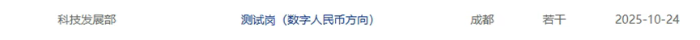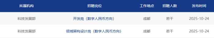 根据招聘信息显示,三个岗位的工作地点均在成都,其中开发岗(数字人民币方向)负责深入分析业务需求,撰写技术方案和系统设计;负责完成详细设计和编码任务,确保项目的进度和质量;负责快速分析解决复杂技术问题,负责后端服务的日常维护、线上问题排查、性能问题优化工作等。