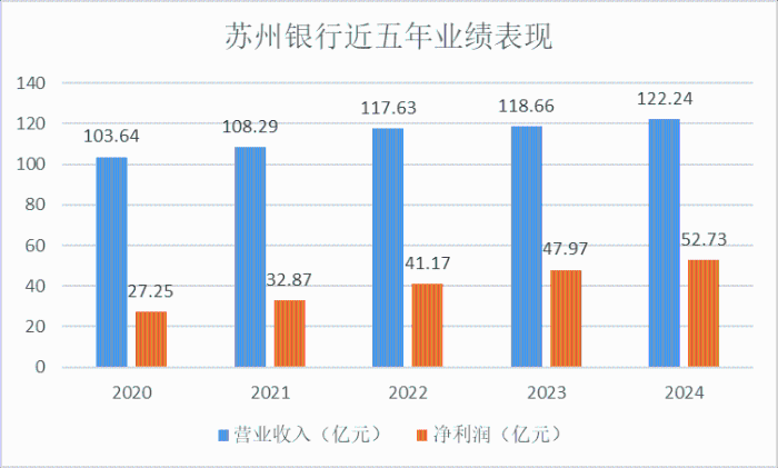 面对银行业息差收窄、竞争加剧的行业挑战,苏州银行通过“资产端提收益、负债端降成本、中间业务补增长”的策略,实现了经营业绩的稳健增长。从近五年业绩表现来看,苏州银行呈现出营收与净利润双轨稳步增长的态势。企业预警通数据显示,2020-2024年,营业收入从103.64亿元攀升至122.24亿元,净利润从27.25亿元增长至52.73亿元,五年间营收增长近两成,净利润实现翻倍增长。而且上市以来,苏州银行净利润增速持续高于营收增速,2022年净利润同比增长25.25%,2023年增长16.52%,2024年增长9.92%。