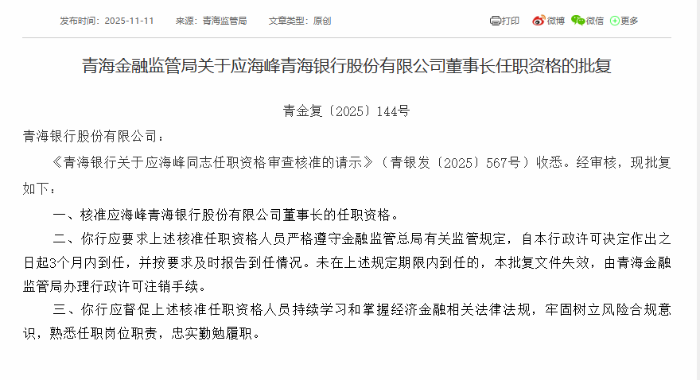 批复显示,青海银行应要求上述核准任职资格人员严格遵守金融监管总局有关监管规定,自行政许可决定作出之日起3个月内到任,并按要求及时报告到任情况。未在上述规定期限内到任的,批复文件失效,由青海金融监管局办理行政许可注销手续。