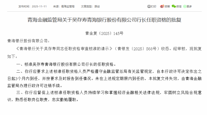 日前,国家金融监督管理总局青海监管局发布批复,核准应海峰青海银行股份有限公司董事长的任职资格,核准吴存寿青海银行股份有限公司行长的任职资格。