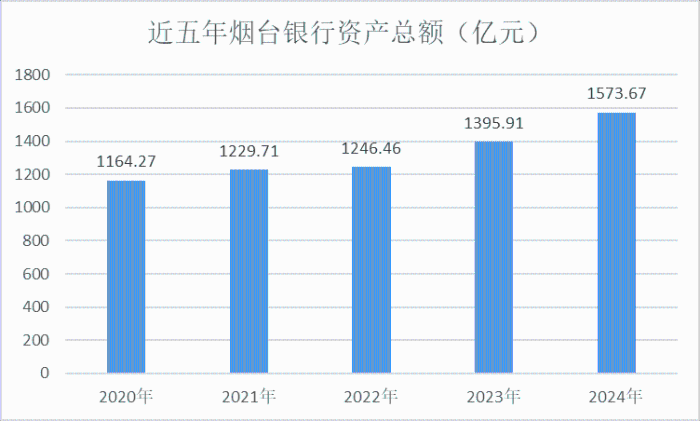 规模方面,烟台银行总资产由2020年末的1164.27亿元增加至2024年末的1573.67亿元,5年间增加了409.4亿元。其中2022年以来,该行资产规模增速较快,2023年末和2024年末该行资产增速分别为11.99%和12.73%,连续两年实现两位数增长。