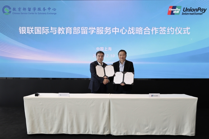 2025年12月10日,银联国际与教育部留学服务中心在上海签署战略合作协议。双方将充分发挥各自在留学服务、跨境支付领域的核心优势,围绕出境及来华留学场景深化合作,为中外学子提供便利、高效的留学金融支付服务。银联国际首席执行官王立新,教育部留学服务中心党委书记、主任王大泉代表双方签约。银联国际副总裁庄蓓,教育部留学服务中心党政办公室主任孙孟钊、国际合作处处长余海婴共同出席签约仪式。