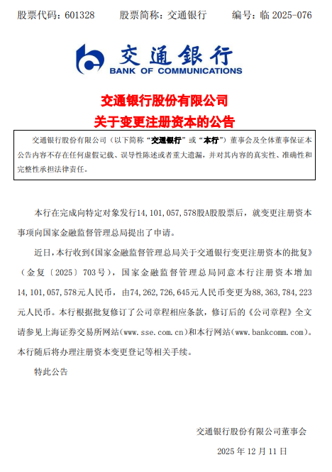 交通银行今日发布关于变更注册资本的公告。公告指出,近日,该行收到《国家金融监督管理总局关于交通银行变更注册资本的批复》(金复〔2025〕703号),国家金融监督管理总局同意该行注册资本增加14101057578元人民币,由74262726645元人民币变更为88363784223元人民币。