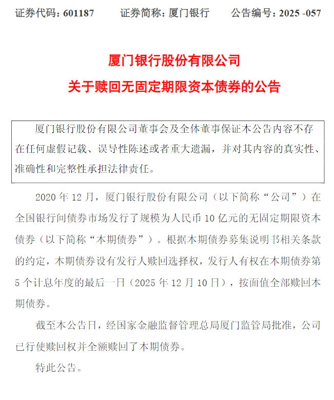 近日,厦门银行发布公告称,已于2025年12月10日全额赎回2020年发行的规模为10亿元的无固定期限资本债券,相关操作已获国家金融监督管理总局厦门监管局批准,标志着本次债券赎回工作圆满完成。