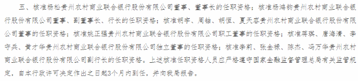 批复文件明确了董事会及高管层任职资格:包括杨松董事、董事长的任职资格;杨鸿钧董事、副董事长、行长的任职资格;李莉、张金禄、陈杰、冯万华副行长的任职资格。
