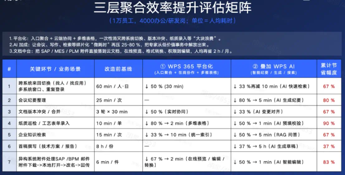 这一集成化方案显著提升了员工的工作效率:每日有30万条待办及已办数据经由WPS 365协同流转,集中化的审批模式替代传统的跨系统操作,预计每日为银行节省超2000工时。