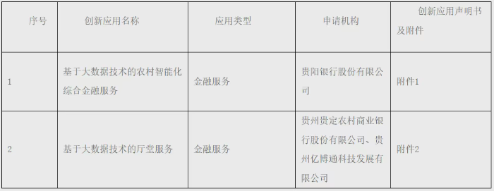 该批次金融科技创新应用共2个,涉及的银行均为中小银行,包括贵阳银行、贵州贵定农商银行,涉及大数据技术、分布式技术、机器人流程自动化、电子围栏、图像识别与抓取、策略建模、交易反欺诈、ESB等技术。