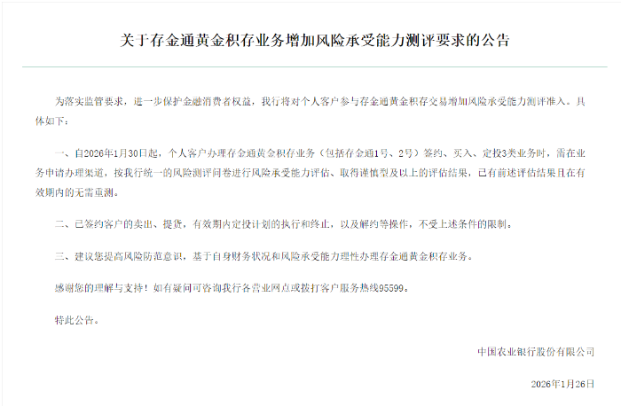 今日,中国农业银行发布公告,宣布将对个人客户参与存金通黄金积存交易增设风险承受能力测评准入要求,相关规则自2026年1月30日起正式生效。