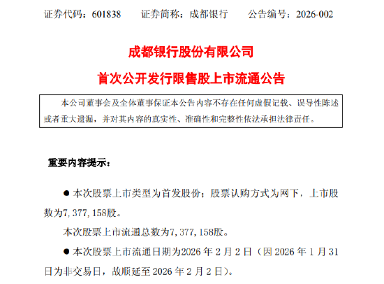 核心提示167名股东合计所持738万股首发股份将于2026年2月2日上市流通