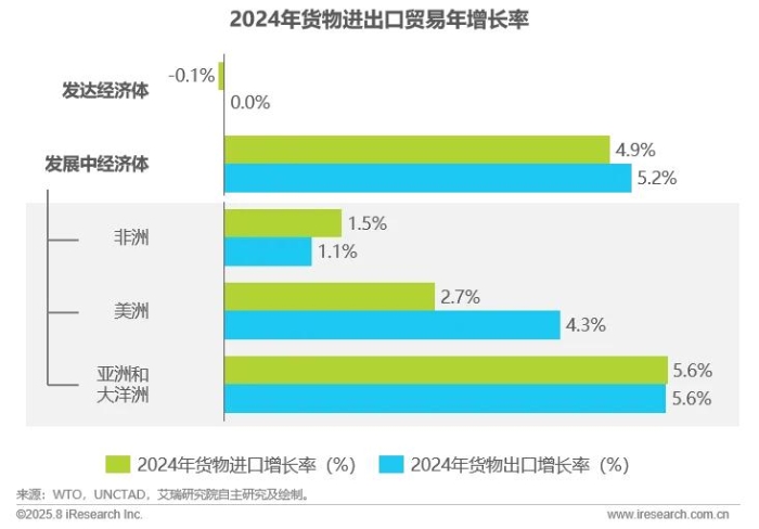 2020年至2024年,全球进出口贸易总体呈现稳步回升态势,并逐步迈入结构优化阶段。在总量增速趋缓的背景下,服务贸易持续展现出更强劲的增长势头,成为驱动全球贸易扩张的核心力量。这反映出全球产业结构正加速由传统制造导向,向数字服务、知识产权以及金融与科技服务等领域转型。与此同时,全球区域表现显著分化,亚洲和大洋洲等新兴经济体在全球贸易中的地位持续提升。相比之下,发达经济体在2024年则整体陷入低速甚至零增长的困境。全球贸易重心正加快向发展中经济体转移,服务化、数字化和区域合作将共同推动新一轮全球贸易格局重塑。值得关注的是,受美国加征关税与全球经济不确定性影响,世界贸易组织(WTO)于2025年4月将今年全球商品贸易额增幅从年初预期的+2.7 %调整为−0.2 %,反映出全球贸易面临的系统性风险持续上升。