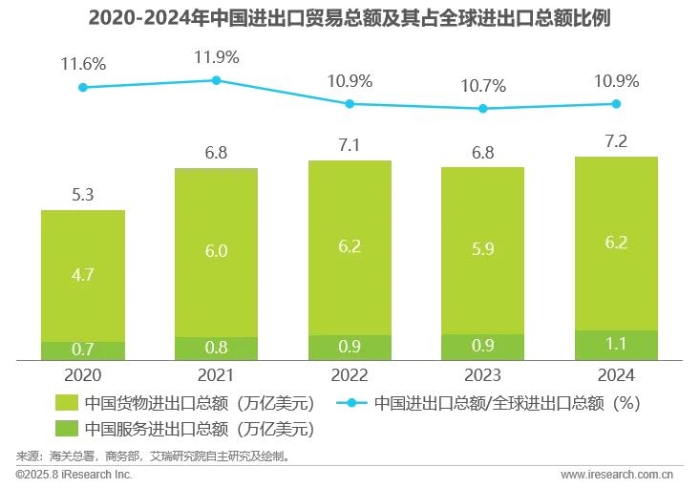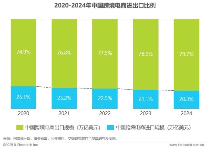 2020年至2024年,中国跨境电商保持稳中有进,年均复合增长率约为15%,全球份额维持在50%以上,凸显其在全球电商供应体系中的关键地位。从进出口结构来看,出口端以17%的年均复合增长率持续主导增长格局,成为稳外贸、促结构优化的重要力量。相比之下,进口端增速相对平稳,年均复合增长率约10%,聚焦功能性、健康消费与新兴品牌的引入。2025年以来,中美贸易摩擦仍对行业构成挑战,美国取消低货值小包免税优惠并对部分商品加征关税,但双边贸易对话和部分关税的阶段性回调,为跨境电商企业提供了调整空间。面对复杂外部环境,中国跨境电商正加速推进供应链数字化、海外本地化运营及品牌建设,提升全球价值链中的控制力和竞争力,推动行业从规模扩张向高质量发展转型。
