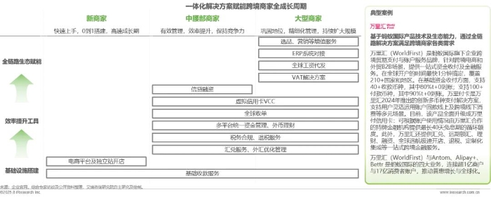 跨境支付服务商是跨境贸易生态的重要参与者之一,通过提供刚需的收款和支付服务,与跨境商家建立深入连接,培养商家信任度并发现其真实需求及痛点。跨境支付服务商通过纵向深化及横向拓展延伸出一系列增值服务,全链路赋能跨境商家全成长周期。从帮助新进入的商家一键开店、实现0到1快速搭建,伴随着商家的规模成长与渠道扩张,提供外汇、税务、资金管理、融资、VCC等相关服务,直至陪伴其成长为大型头部商家,服务商提供选品、营销、ERP系统对接等一站式衍生服务。
